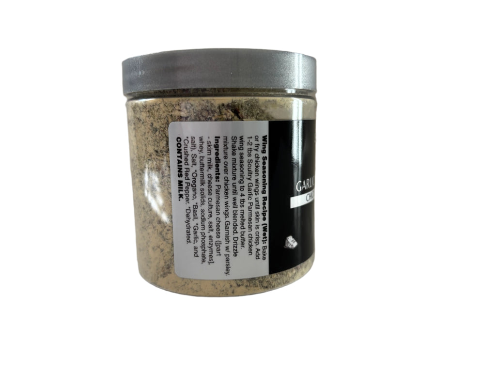 Ingredients: Parmesan Cheese ([part-skim milk, cheese culture, salt enzymes], whey, buttermilk solids, sodium phosphate, salt), Salt, *Oregano, *Basil, *Garlic, and *Crushed Red Pepper. *Dehydrated CONTAINS: MILK*